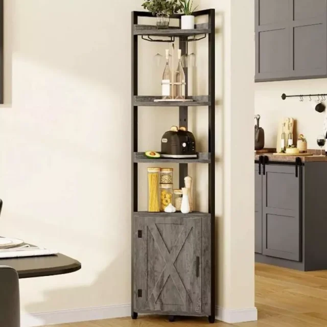 The charm of our corner bookcase lies in its farmhouse-style grey color and barn door design. It adds a touch of country elegance to any room, creating a cozy and inviting atmosphere. Whether you’re looking to showcase your favorite books, decorative pieces, or need extra storage space, this corner shelf is the perfect choice for you.