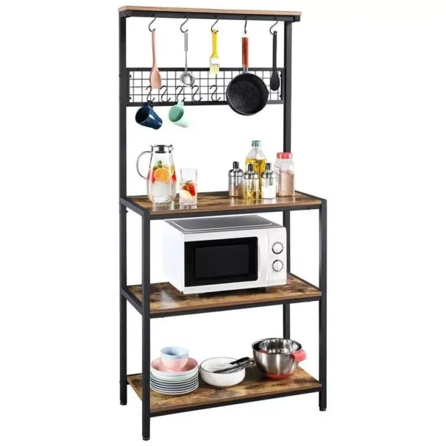 This bakers rack is not just a storage solution; it’s a statement piece that adds character and convenience to your kitchen. Its rustic brown color and matte black finish create a warm, inviting atmosphere. The ease of cleaning, combined with its resistance to water and heat, makes it a practical choice for the busiest room in your home.