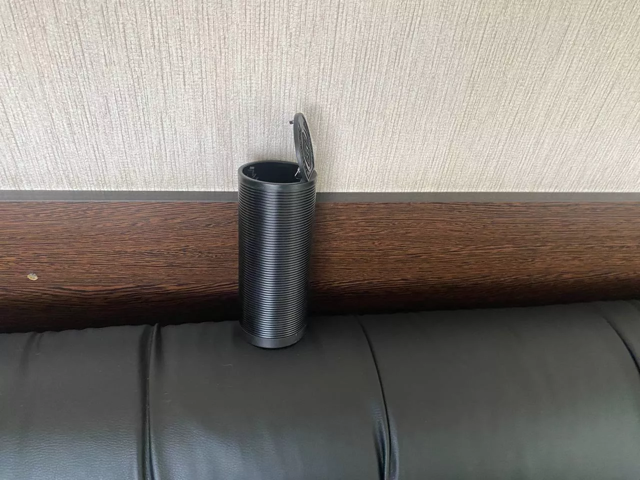 This one is a nice-looking trash can in the shape of a cup , fits well in the cup holder . small garbage such as used face masks or paper receipts is now goes into this cup... it is easy to use with just one touch . Ordered one for our family minivan and we all love it.
