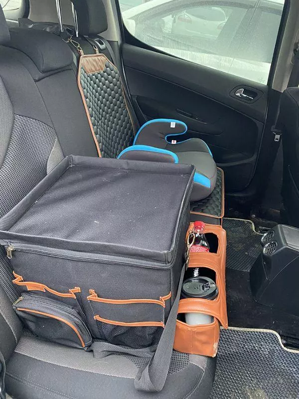 I finally found a solution for all the stuff in my front car seat! I got this awesome organizer that lets me arrange everything just the way I want it. I've got a spot for a tissue box, water bottle, phone, car charger, snacks, tablet, pen, sunglasses, and more. It's so handy because now I can grab whatever I need without even looking away from the road. It's like having a designated spot for everything. This little organizer is really great!
