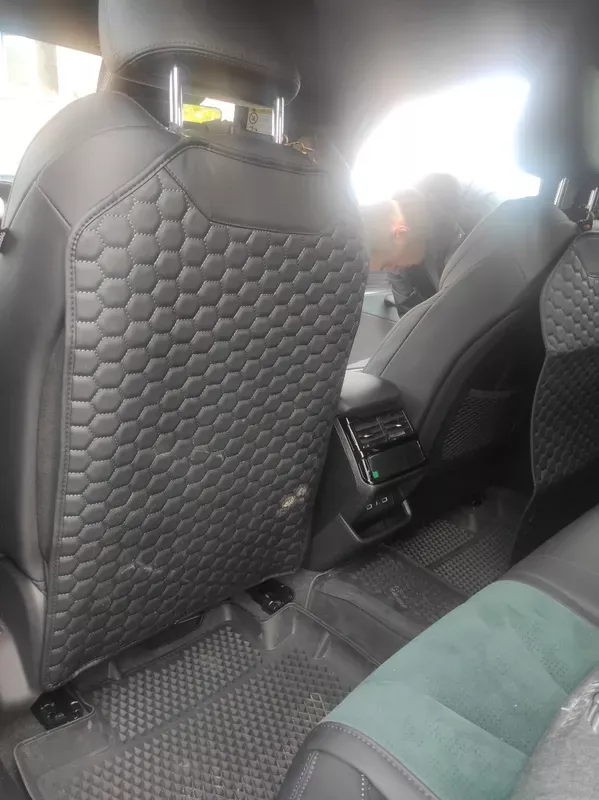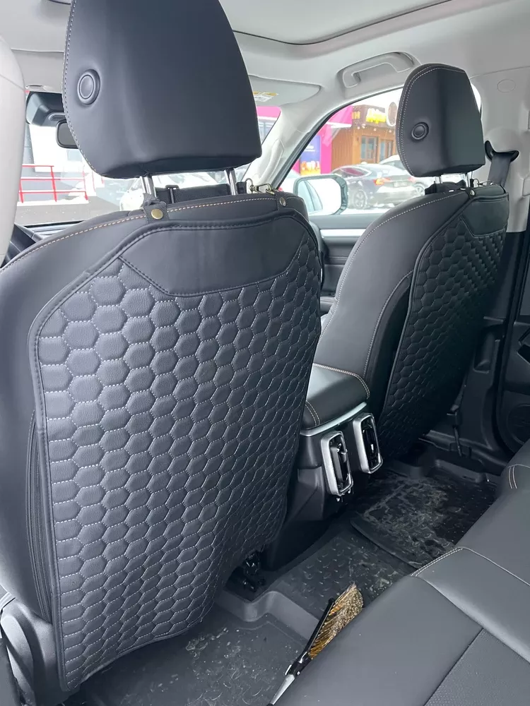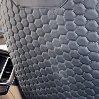Our seat back protector features a five-layer construction with upgraded premium eco-leather on top, two layers of high-density foam, 600D Oxford, and an anti-slip rubber backing.