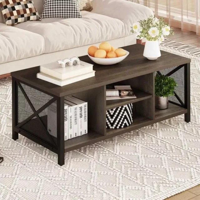 This coffee table is best utilized in living rooms, offices, or even bedrooms where a touch of elegance is desired along with practicality. The dark walnut finish and airy open metal frame add a farmhouse-industrial flair that complements a variety of decor styles.