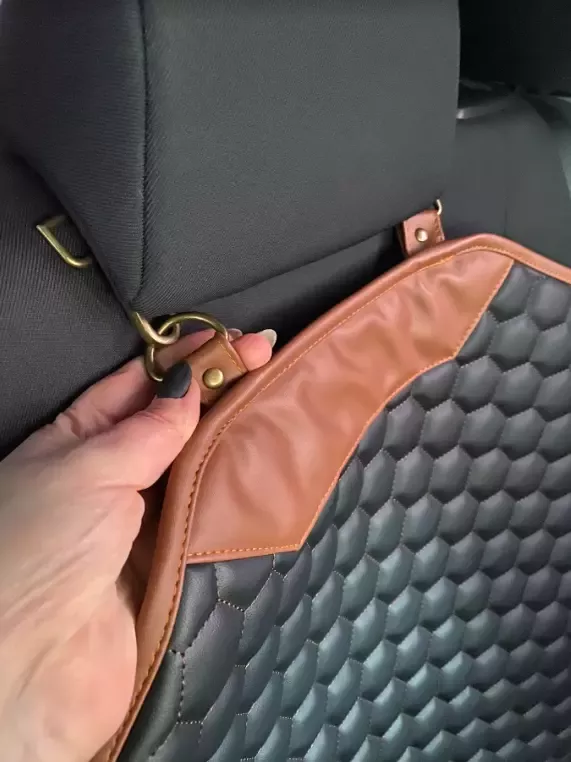 This seat protector attaches securely to the seat with durable metal hooks and installs easily in less than a minute.