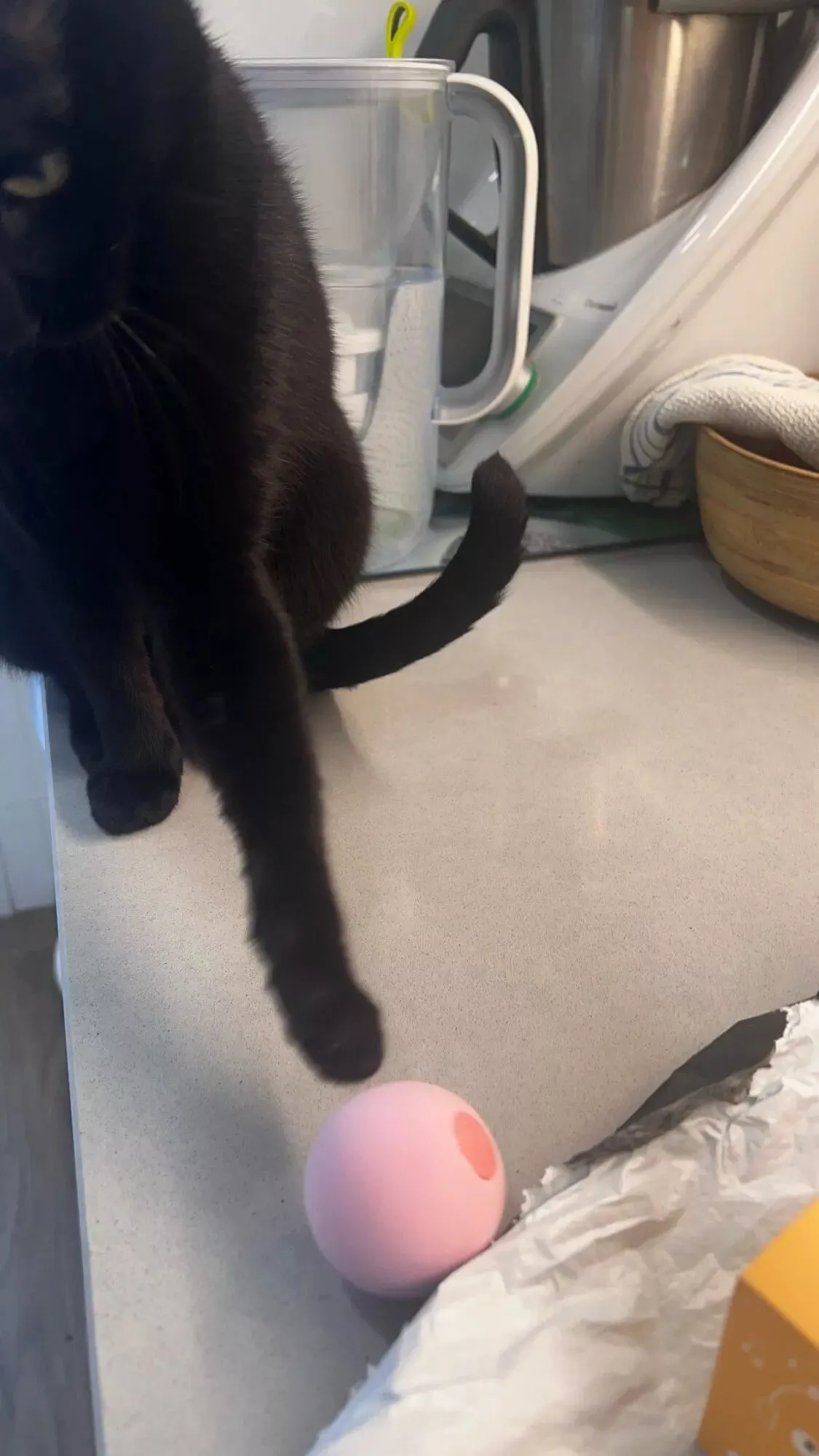 It's funny. Works well even if it slips on the ground. Cats have liked it although they pay little attention to it already. The package has been very broken but it works