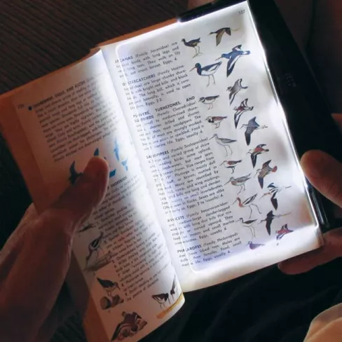 I like how it makes the page glow instead of having a hanging light above your book which is more noticeable in a room you wish to keep dark where others might be sleeping. A couple of things I was curious about... First, off I thought I might be able to place the panel behind the page I was reading so that it would glow thru essentially, but that did not work the best. You really need to place the panel ON TOP of the page you’re reading. But the good thing is you really don’t need to flip the panel from left to the right page, I found that keeping the panel on the right side it would still provide sufficient lighting to the left side. So you don’t have to move the panel as much. And for larger books, the panel may not cover the entire page but the lighting fans out so it will adequately illuminate the entire page so I found the size of the panel to be just fine. I really like this light :)