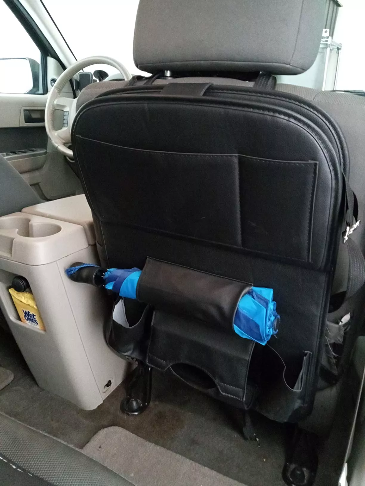 This car organizer is decent for the back seat to use on a road trip. I like the fold-down tray, but the tray isn’t very strong. I don’t think it would support a laptop. I used it for my phone and sunglasses. I like the umbrella holder. The tissue box holder was an odd size, so that didn’t work for me. I put a package of wet wipes there instead.