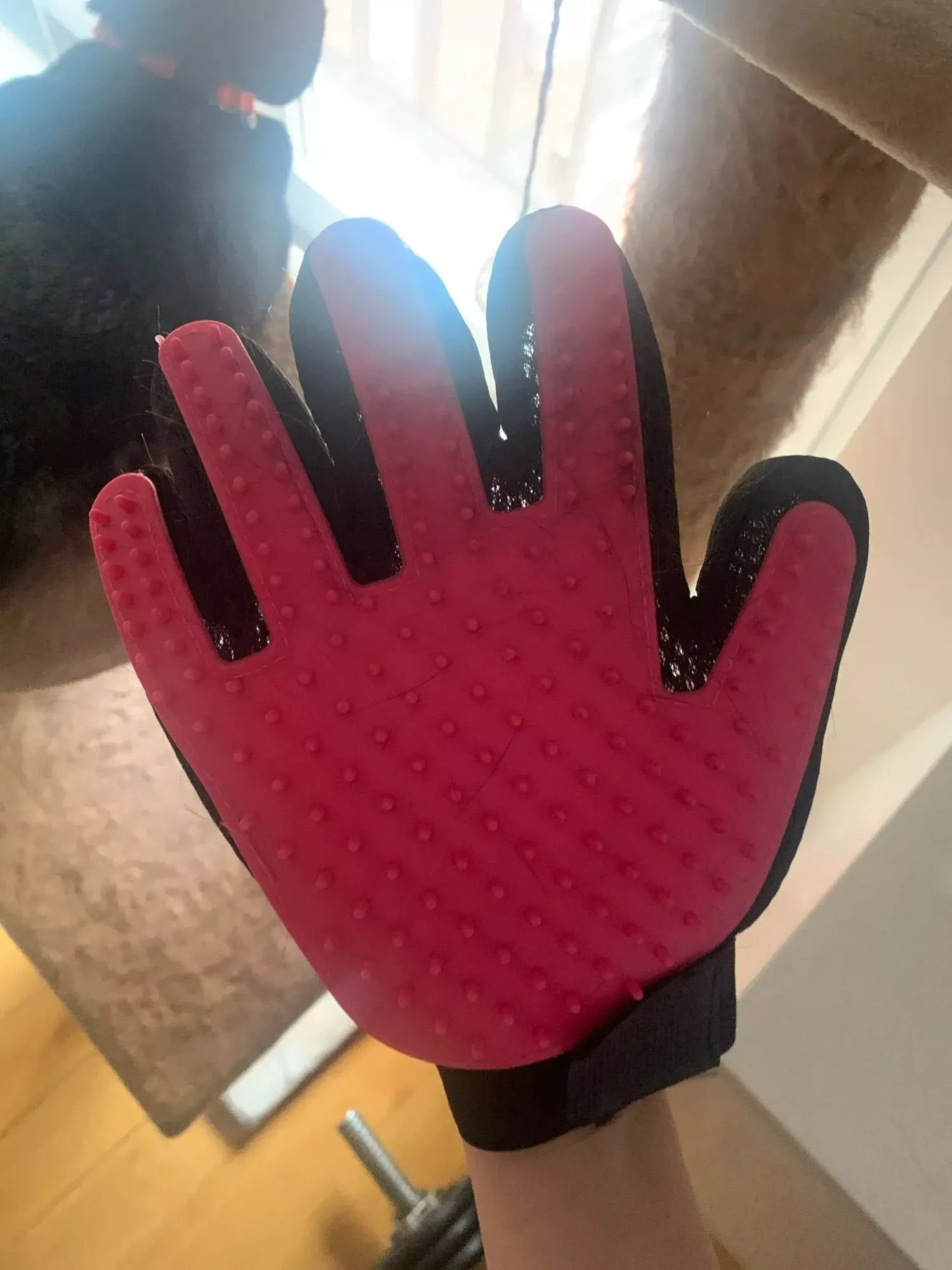 i recently purchased this grooming glove, and it has been a game-changer for my pet’s grooming routine. my pet used to dread grooming sessions, but now they actually enjoy it. the glove fits perfectly on my hand, making it easy to maneuver. the soft, silicone bristles do an excellent job of removing loose hair and dirt without causing any discomfort to my pet. it also provides a nice, gentle massage that my pet absolutely loves. the glove is easy to clean; the hair just peels right off, and a quick rinse is all it takes to get it ready for the next use. i've noticed a significant decrease in the amount of fur around the house, which is a huge plus. this glove has made grooming sessions quick, easy, and enjoyable for both me and my pet. highly recommend it to all pet owners!