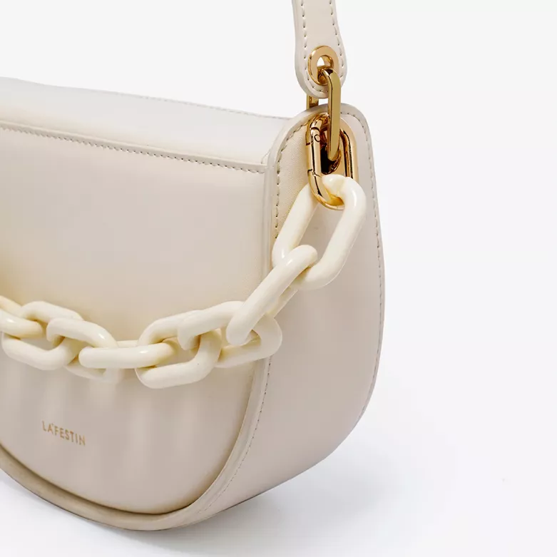 At the heart of its design is a commitment to both aesthetic appeal and practicality. Crafted with high-quality split leather and a durable polyester lining, this purse stands out not just for its beauty but also for its resilience. The unique semi-circle shape, complemented by a chic resin chain decoration, offers a nod to nostalgic elegance while keeping your look modern and fresh.