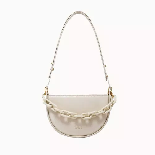 At the heart of its design is a commitment to both aesthetic appeal and practicality. Crafted with high-quality split leather and a durable polyester lining, this purse stands out not just for its beauty but also for its resilience. The unique semi-circle shape, complemented by a chic resin chain decoration, offers a nod to nostalgic elegance while keeping your look modern and fresh.