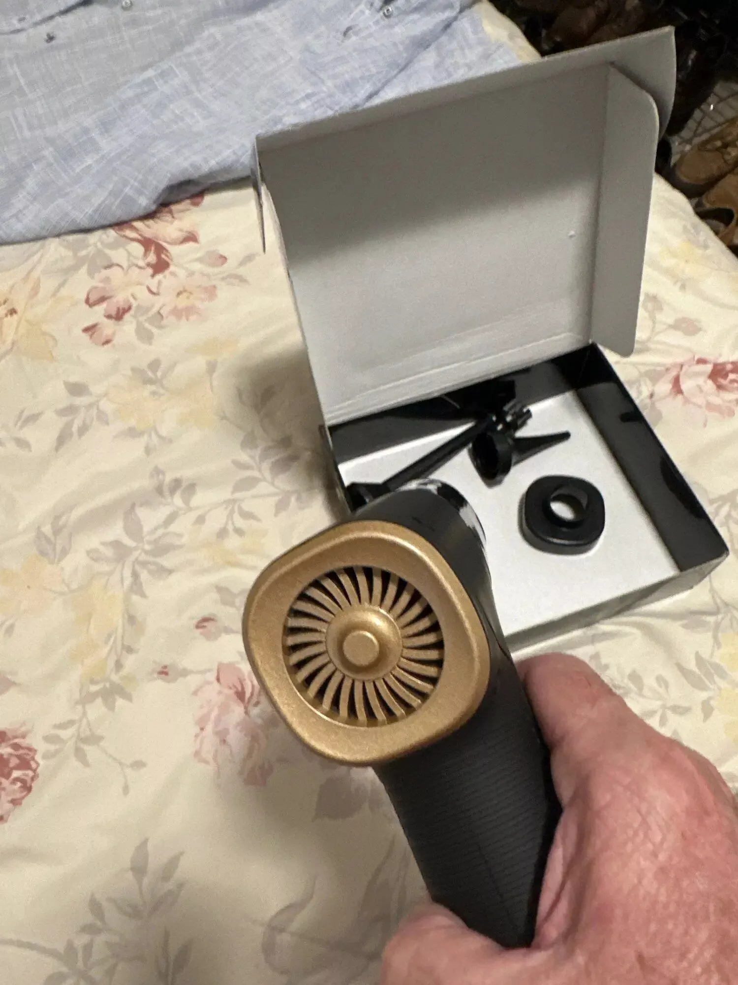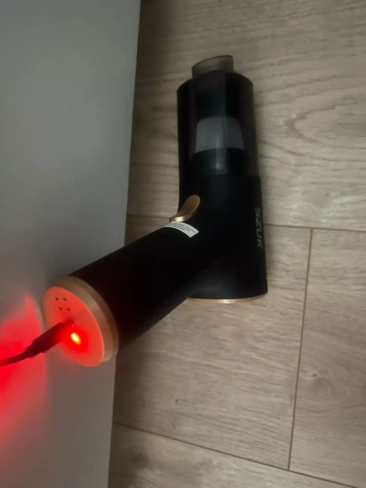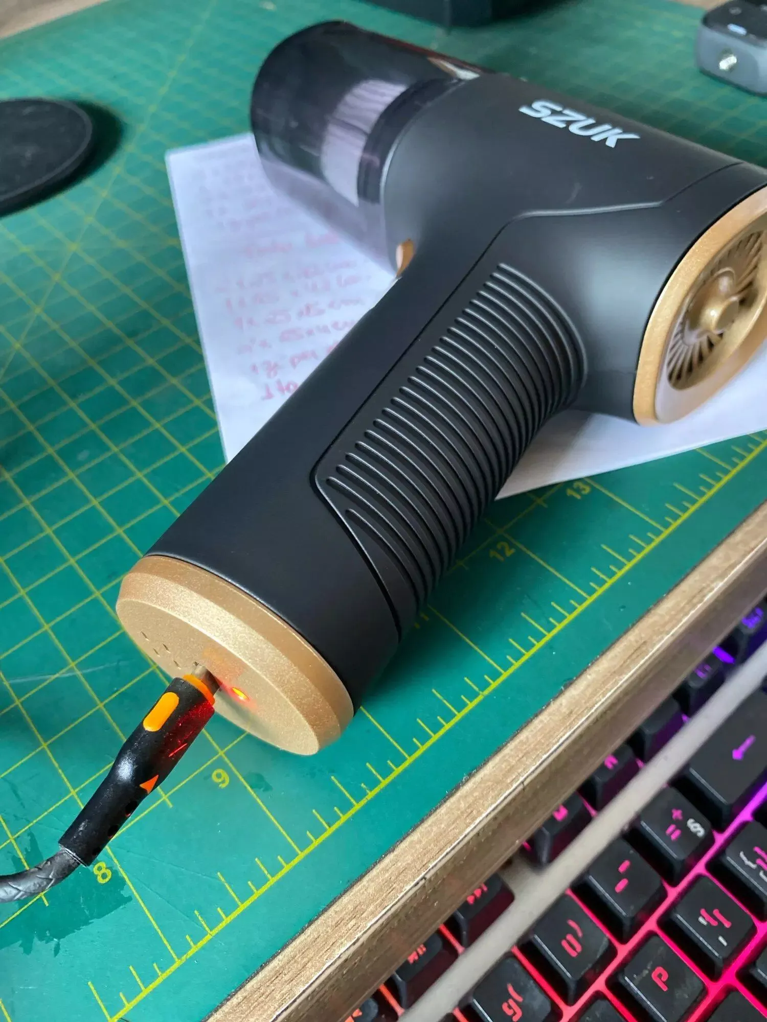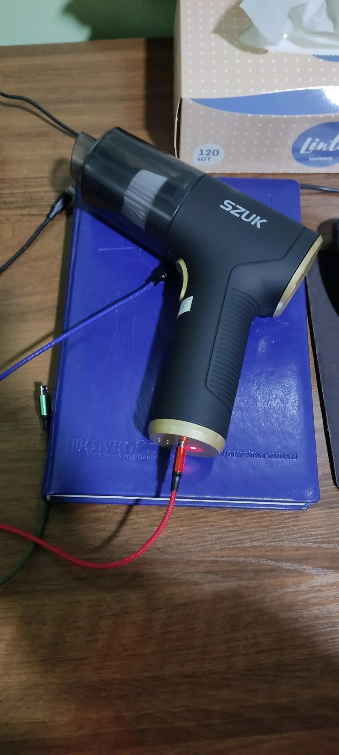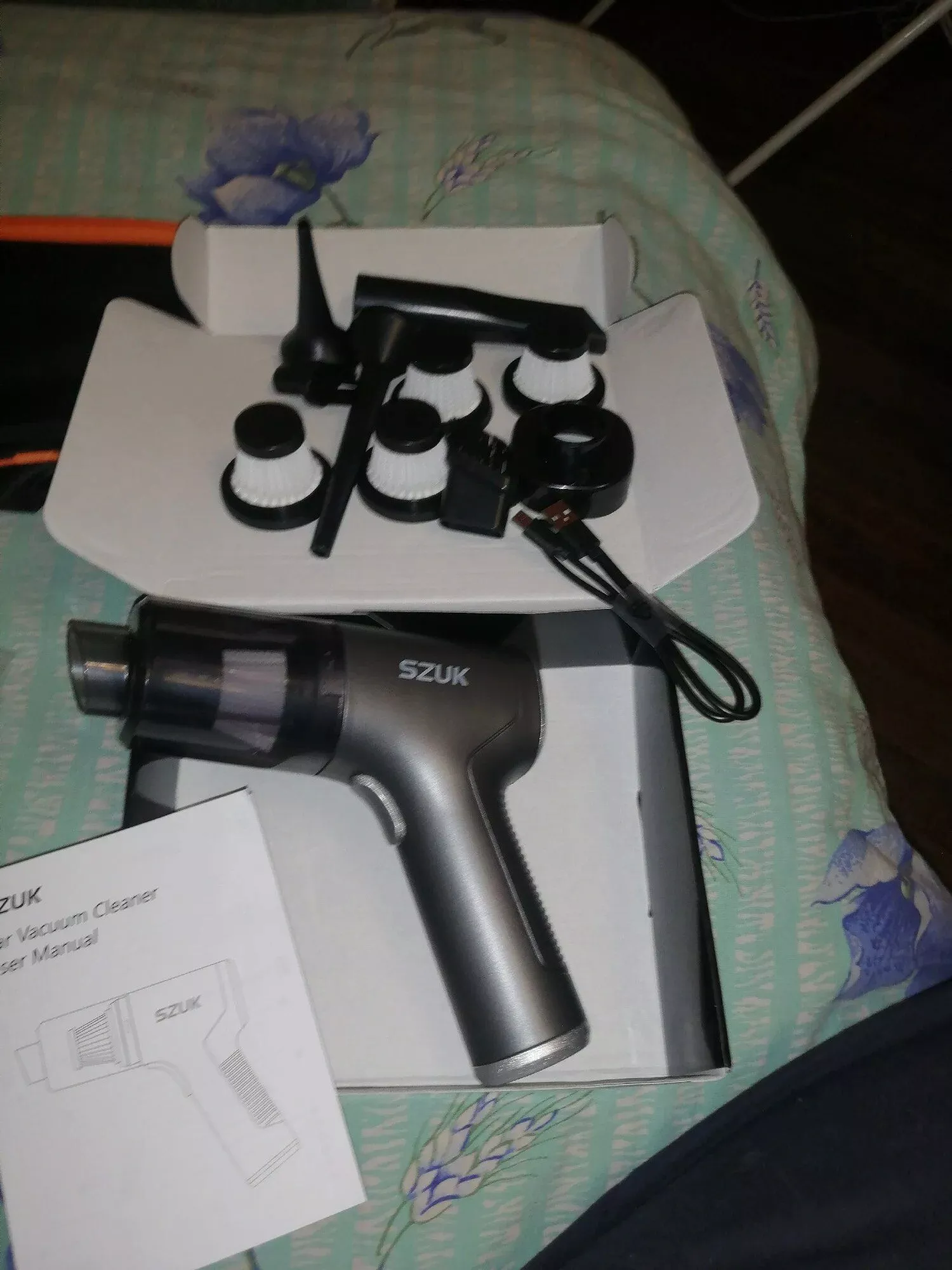 The blower function was perfect for clearing dust from my keyboard, cleaning the car's dashboard, and tidying up electronic equipment like the DVR and DVD player. The included charging cable features a USB type 'A' connector on one end and a barrel connector on the other, fitting standard USB chargers and indicating the charging status. A storage solution for the device, its accessories, and the charging cable is essential. I repurposed a small, padded lunch tote, which serves excellently for this purpose.